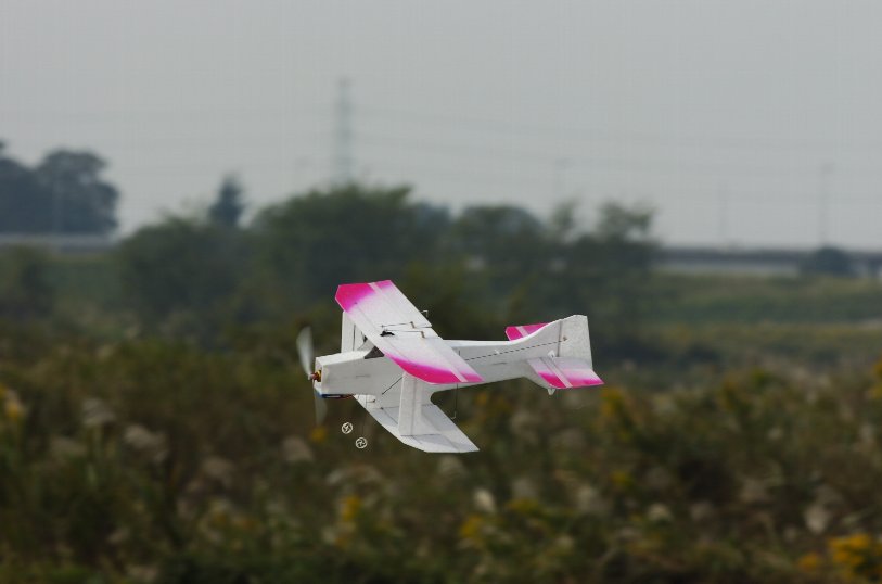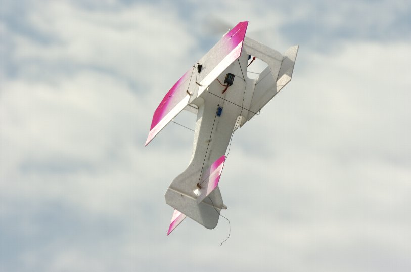 室内用小型複葉アクロ機(設計:戸田淳一氏)オールEPP製。エレベーター、ラダーを当てずにロールが出来るテンサー風な機体、非常に運動性が良く、飛ばしていて楽しい機体です。いままで、外で飛行したことはありません^^; 風が弱ければ飛行します。