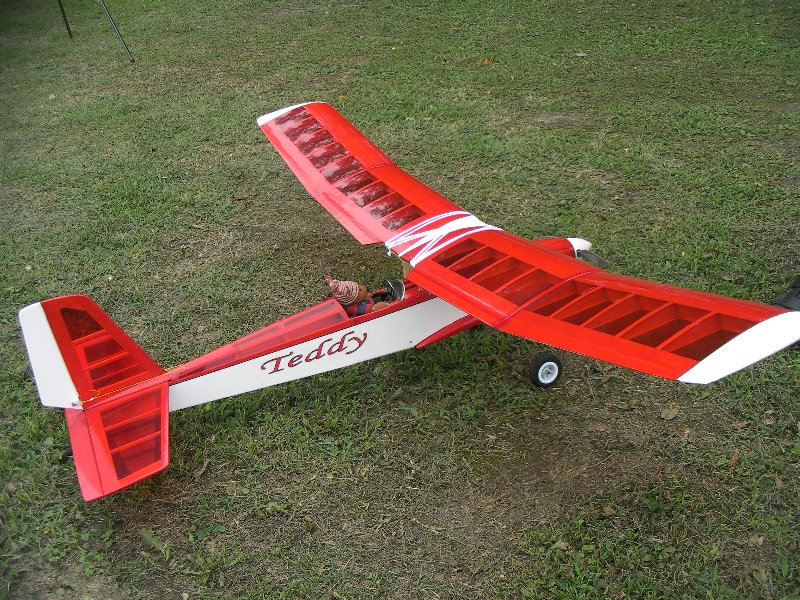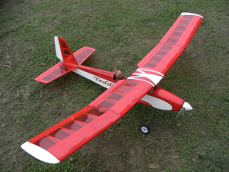 仕上げはベネトンカラーをイメージして仕上げました。 ギアダウンユニット、モーターが外部に側面に顔を出していますが、モーターの冷却、ギアダウンユニットのメンテナンスが良い構造です。 飛行はサーマル、スピード共に楽しめる機体です。 |