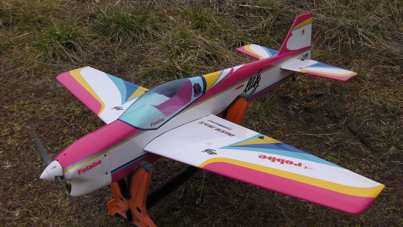 | Description: | 軽量化を意識して製作したところ、飛行重量で1320gで仕上がりました。また、最近っぽくしようと思い、エルロンとエレベータの面積を増やしてあります。まだまだセッティングが煮詰っていません。 |