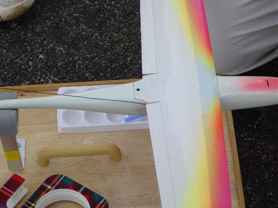 主翼後部の取り付けはボルトではなく、なんとセロテープとのこと。このほうがいざという時はテープが切れて損傷が少ないとのとこ。